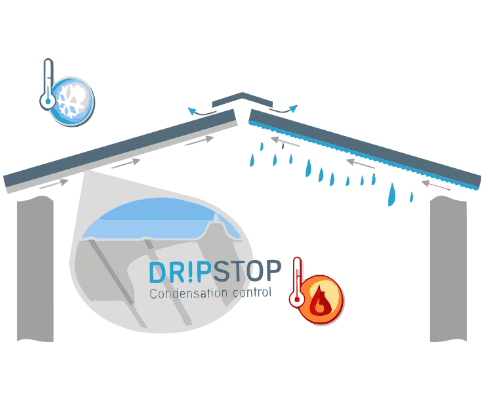 Membrana anticondens Dripstop pentru acoperiș reprezintă o modalitate economică de a rezolva problema condensului în interiorul clădirilor cu acoperiş neizolat termic, prevenind picurarea apei către interiorul clădirii, extinzând durata de viaţă a învelitorilor metalice, mărind izolaţia acustică şi reducând zgomotul de ploaie. Una dintre condițiile de bază pentru o bună funcționare a unui acoperiș modern este folosirea membranei pentru acoperiș cu permisivitate ridicată la vapori (anticondens), care se montează sub învelitoarea principală.
